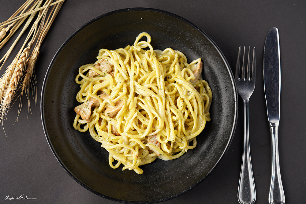 נודלס ברוטב שמנת פסטו עם נתחי עוף צלוי