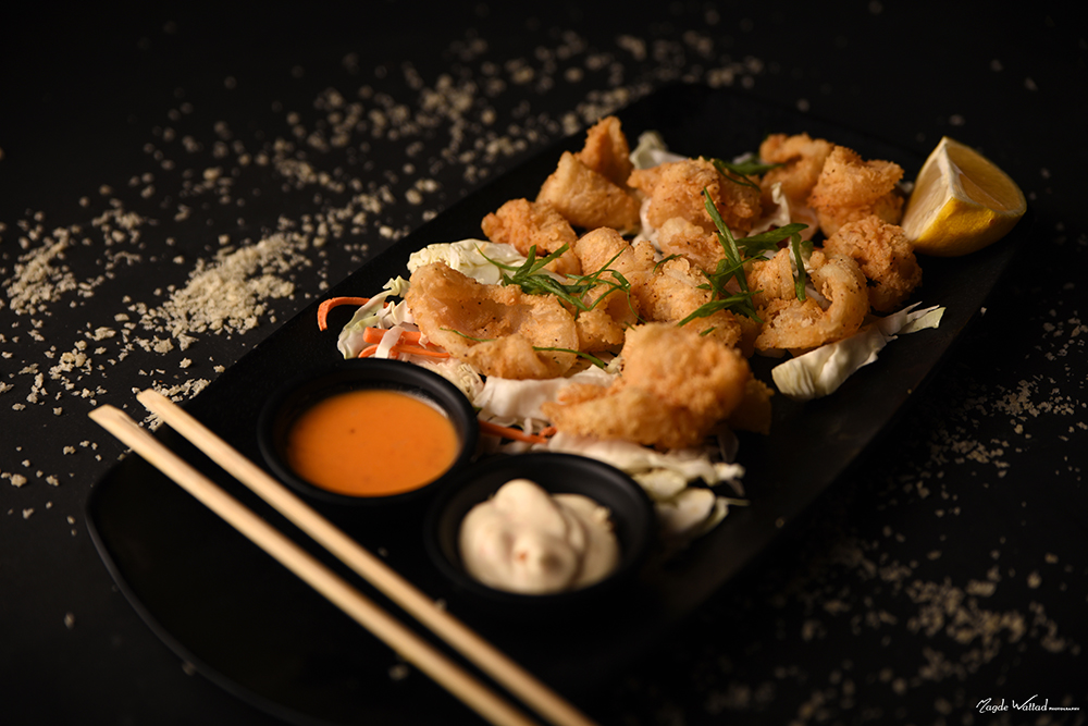 שרימפס מצופה בטמפורה עם רוטב פלפלים לימוני ואיולי טוגארשי